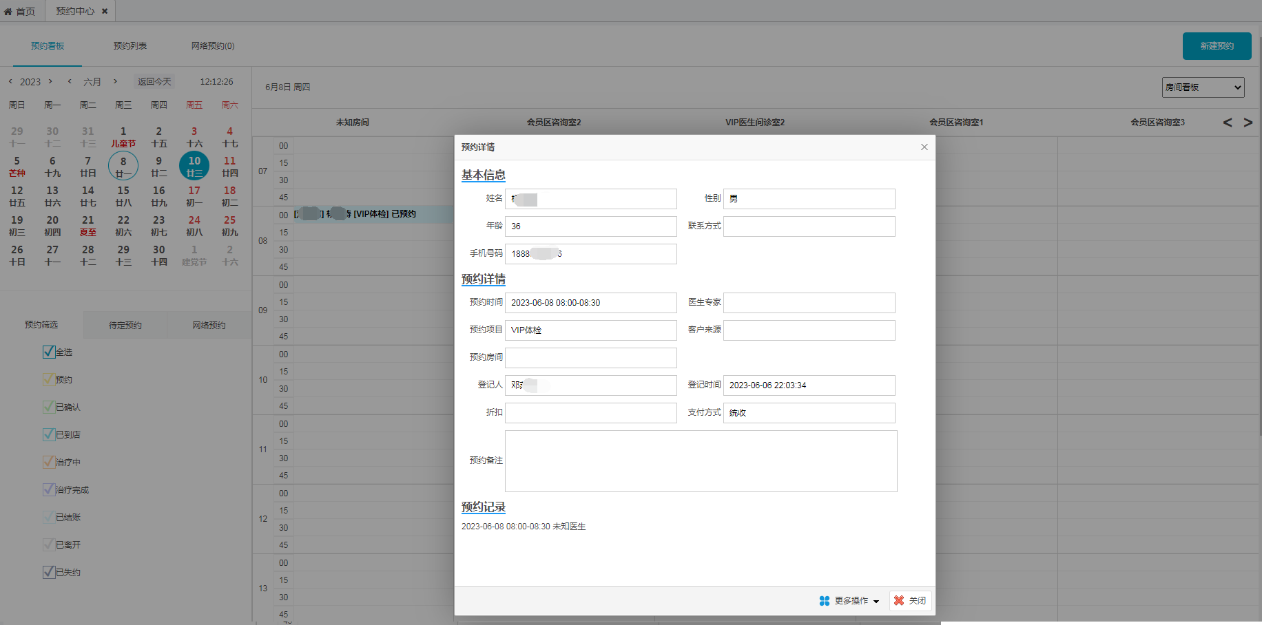 以时间面板、医生看板、科室看板对预约的客户进行管理,并可修改预约、取消预约等