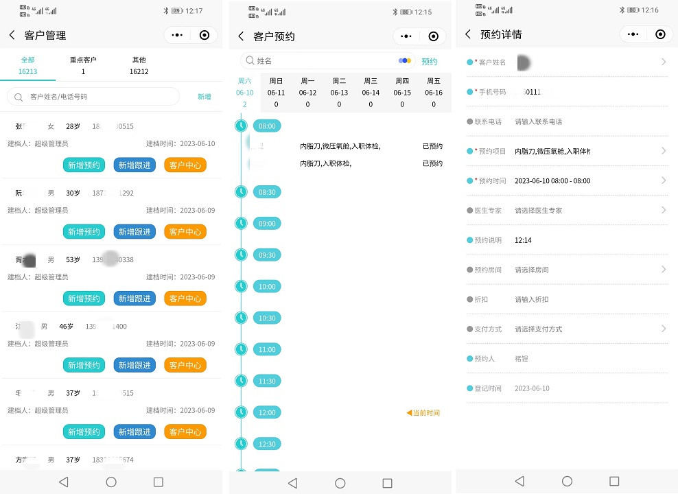员工可以在自己的手机端对客户进行预约,包括对项目、科室、专家医生、时间段等