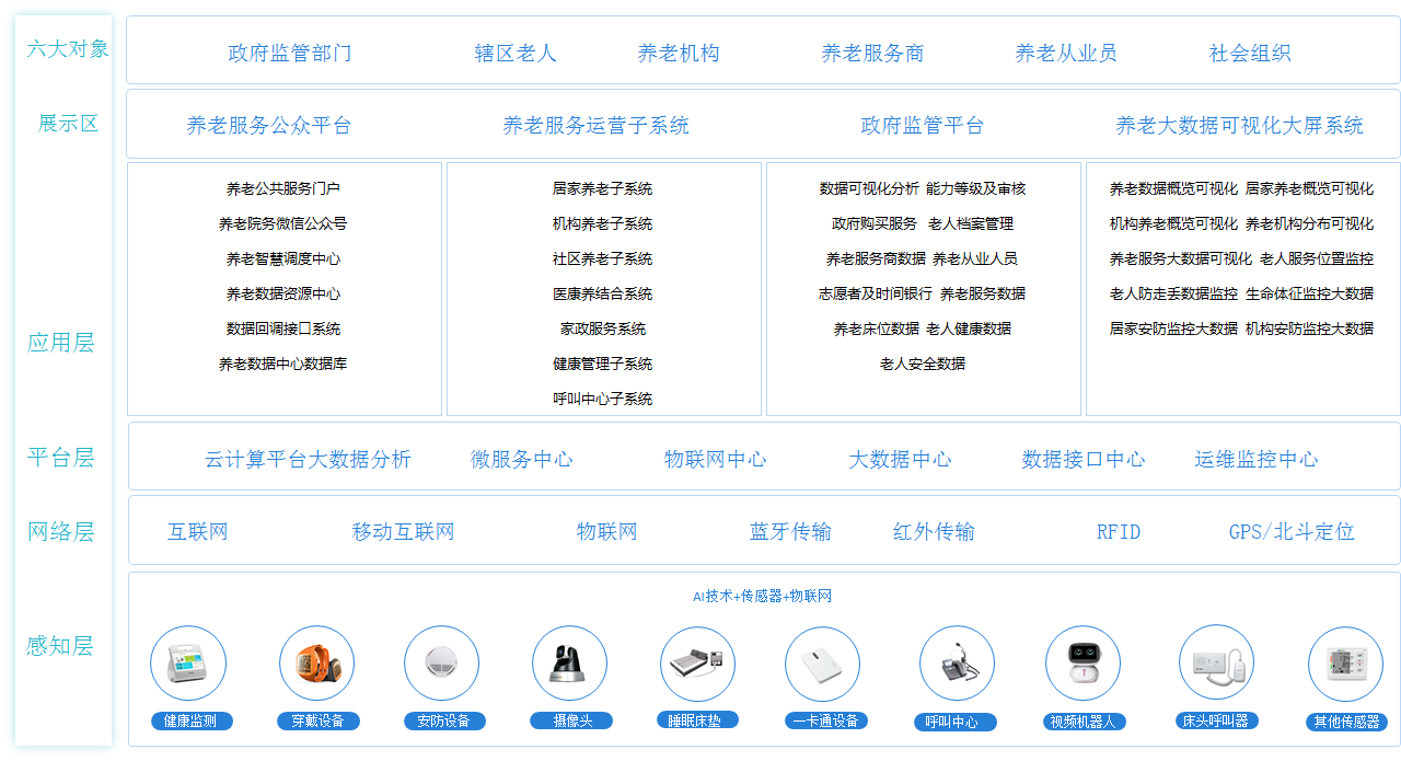 医养佳自主研发产品《民政养老监管系统》分为感知层、网络层、平台层、应用层,同时满足了政府监管部门、辖区老人、养老机构、养老服务商、养老从业人员、社会组织等六大对象的需求