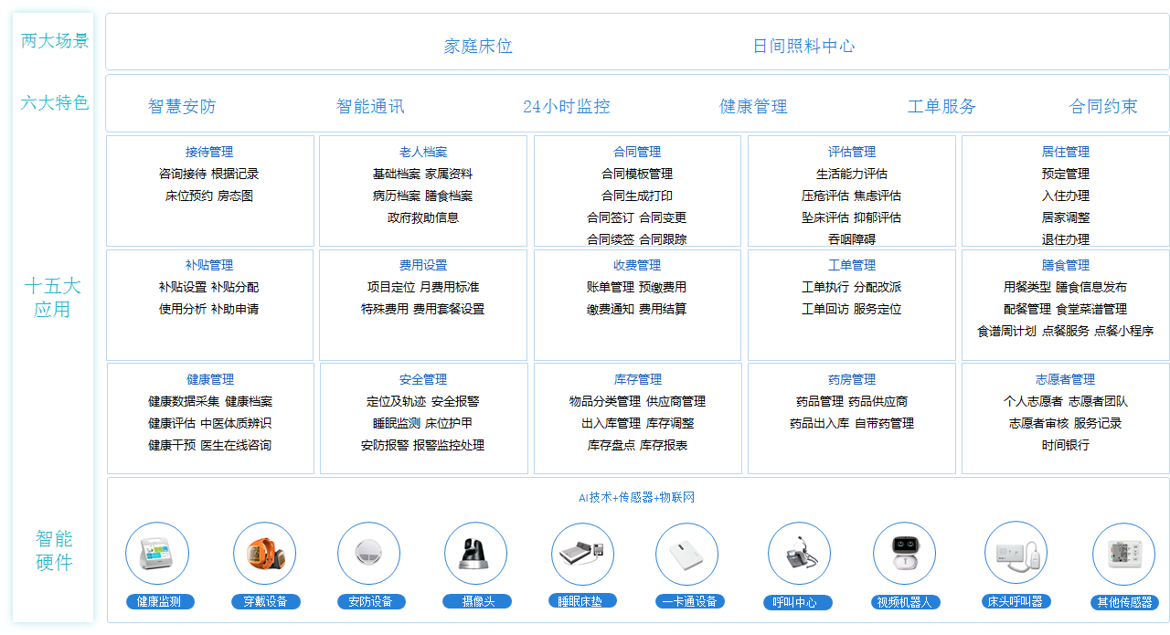 医养佳自主研发产品《社区养老服务系统》底层对接了市面上主流的设备如健康检测设备、穿戴设备、安防设备、睡眠床垫、呼叫器等,在业务方面包含了接待管理、老人档案、合同管理、评估管理、居住管理、费用管理等15个应用