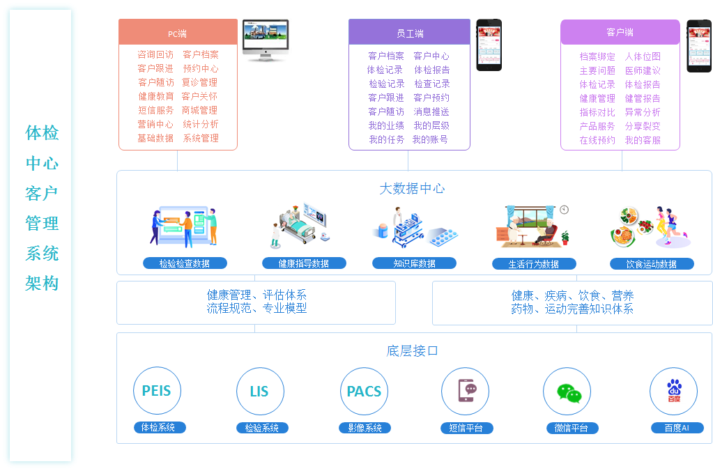 《体检中心客户管理系统》主要应用于医院的体检中心及健康管理中心,旨在为客户提供方便的自我健康管理以及为中心方提供可粘性的服务,系统架构如下: