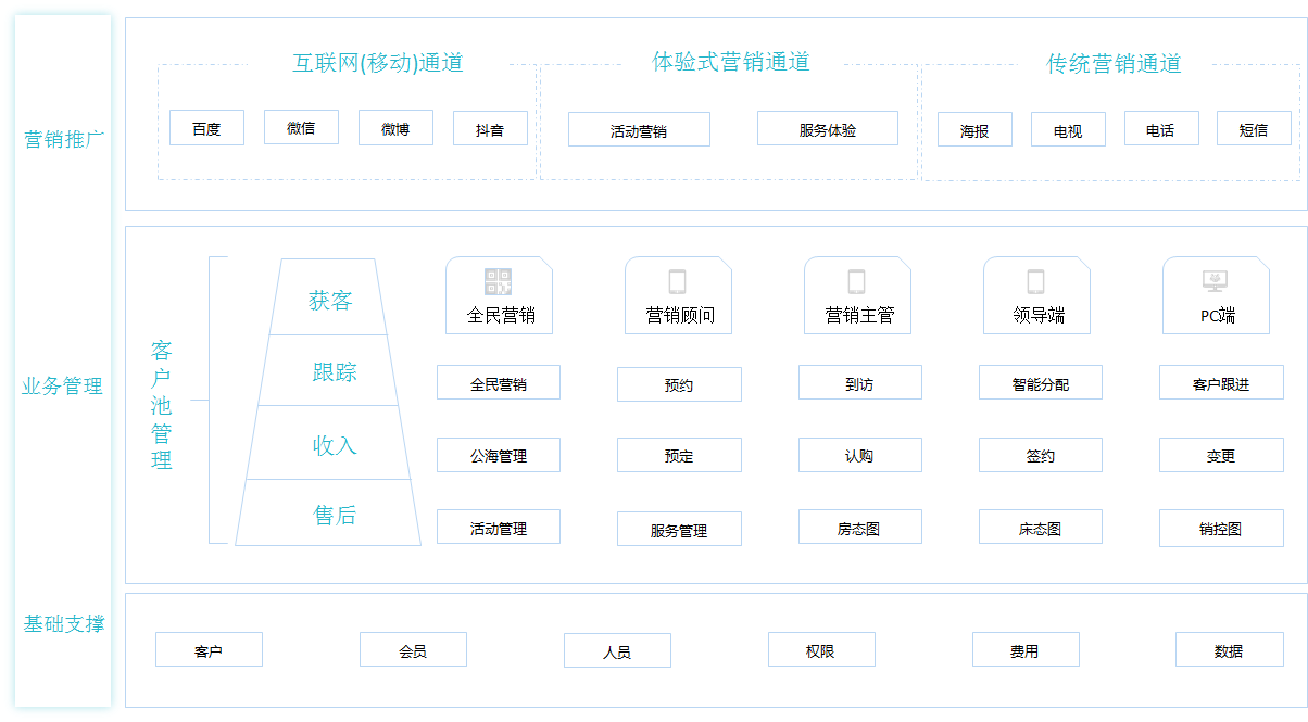 针对养老客户的痛点,整合营销全流程的数字服务,支持营销推广的三个通道,包括互联网移动通道,体验式营销通道和传统营销通道。产品覆盖终端客户、营销顾问、营销主管、企业领导、系统管理等主要利益相关者。并通过会员管理、员工管理、权限管理、费用管理等基础模块,支撑整体的业务框架。为实施养老模式的企业提供整套的营销工具。